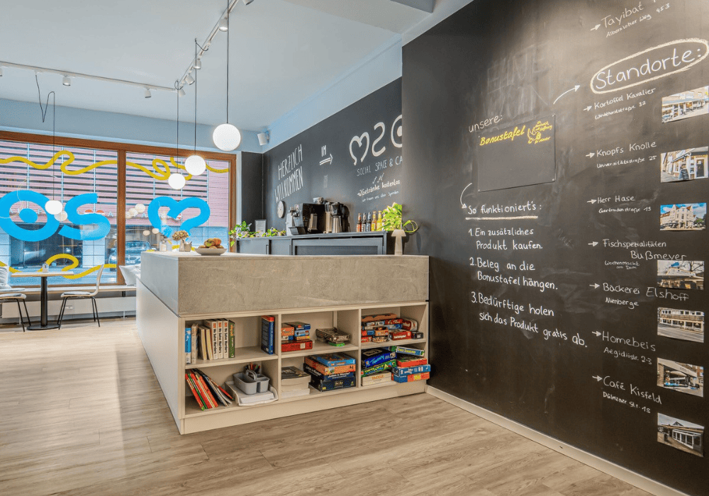 حيث تُجمع التبرعات من ملابس وطعام مقهى في شارع موريتز: حيث تُقدّم الاستشارات وتُعقد الاجتماعات يعمل كلاهما اليوم كطبيبين: أحدهما في إرلانجن والآخر في كيل ومع ذلك، يواصلان العمل في الجمعية.